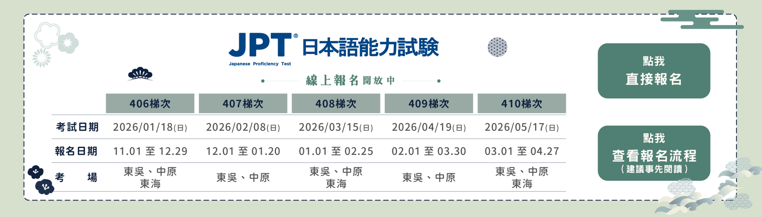 BNN_2026年考試時程BNN_JPT406-410上下 最新消息 最新消息 最新消息 發佈日期 📌2026年考試時程 2025.12.16 第407梯次重要時程公告 2026.02.02 測驗倒數 00天00小時00分鐘00秒